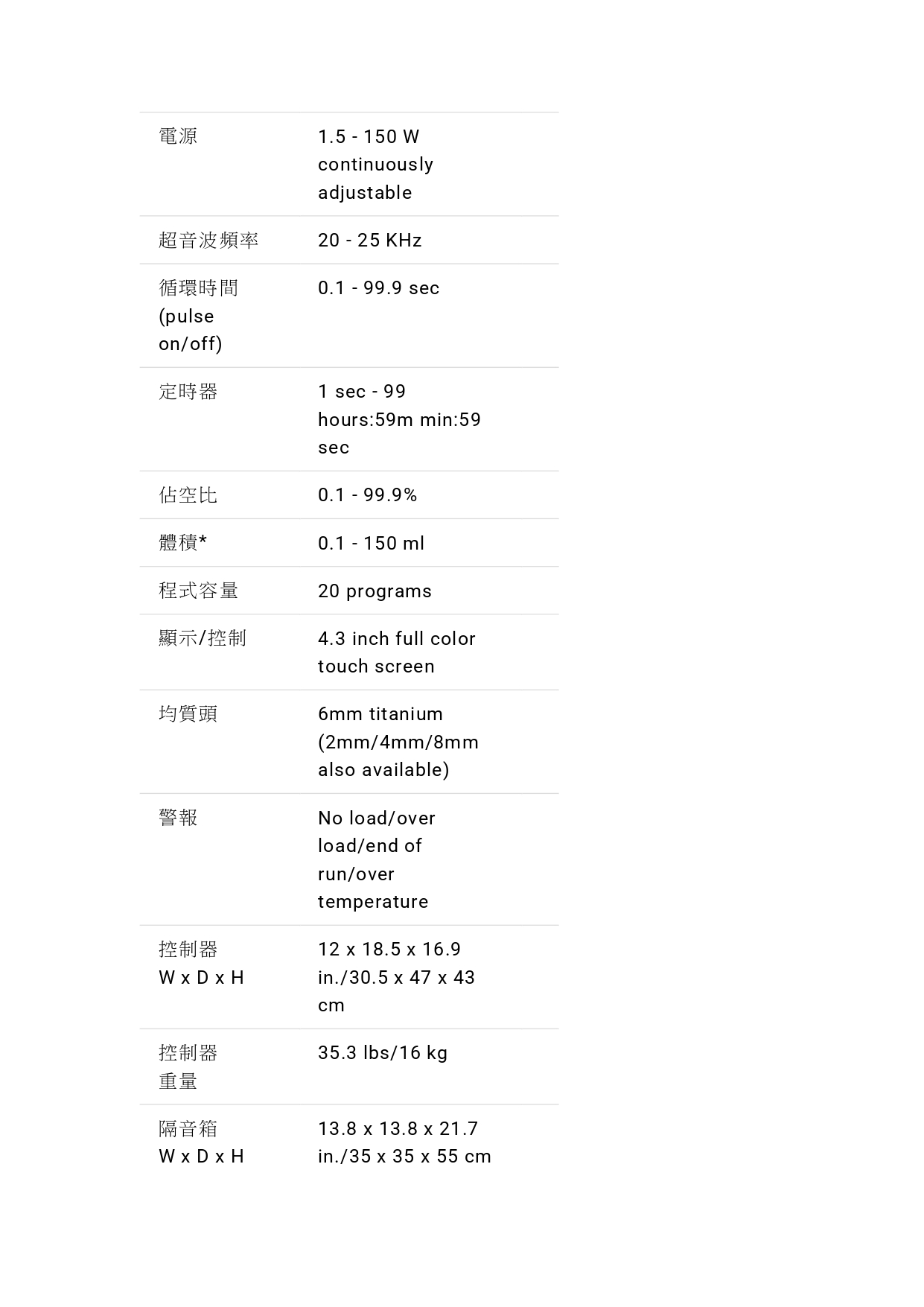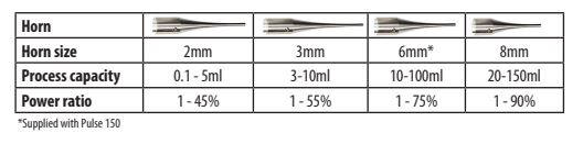 PULSE 150 超音波均質機 探頭規格一覽: