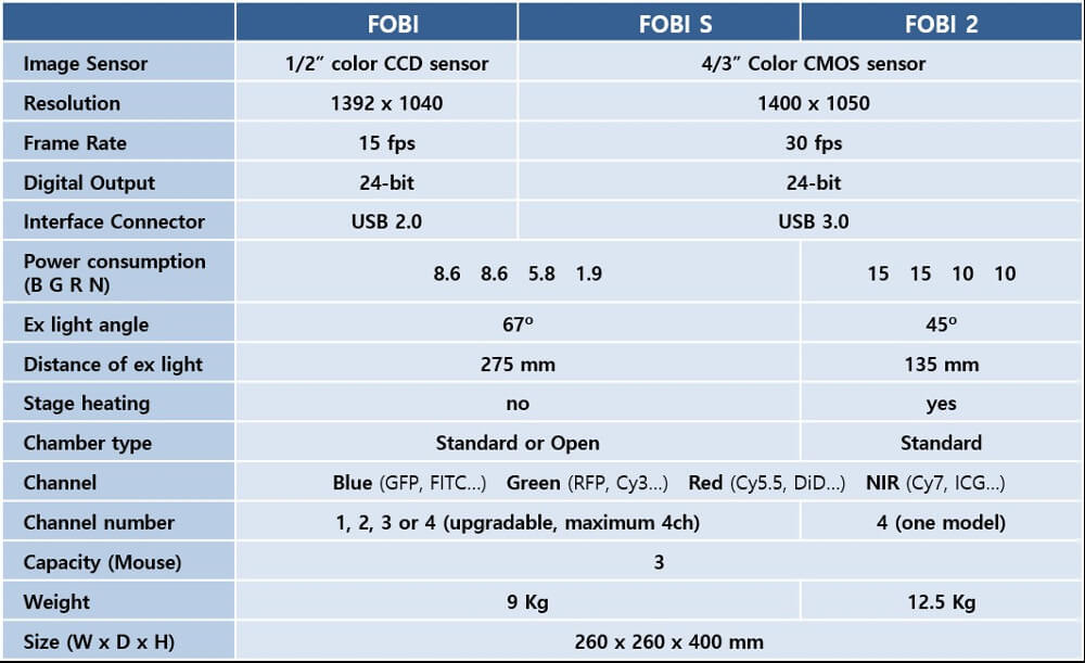 It is possible to apply most fluorescence proteins and fluorescence materials from GFP to ICG using four channels of Blue, Green, Red and NIR. Since more than one fluorescent substance can be imaged, different functions can be observed in one sample. For example, tumor imaging and drug imaging can be performed in the same animal, so targeting and tumorization can be observed simultaneously. You can also merge bright images in order to localization the fluorescence within the animal.