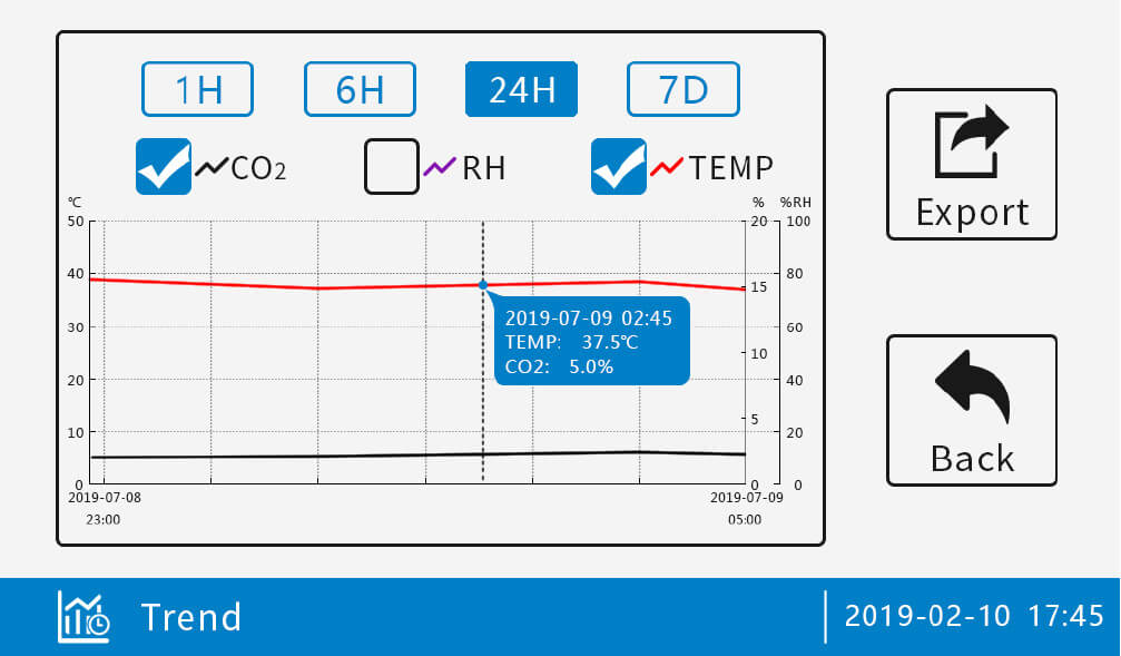 - 高解析電容觸控式螢幕,具可記錄 7 天以上二氧化碳濃度、溫度、相對濕度之變化曲線。